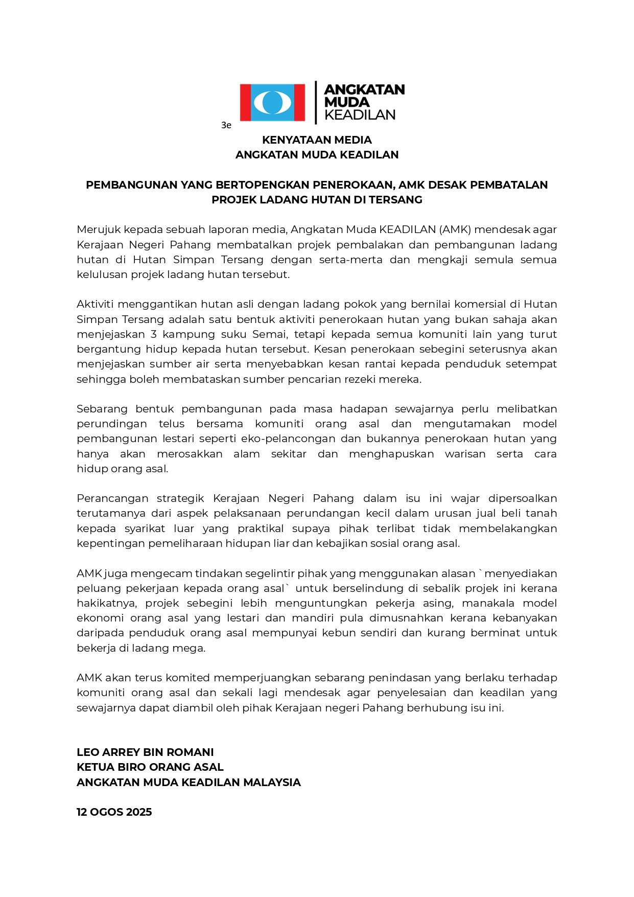 Pembangunan Yang Bertopengkan Penerokaan, AMK Desak Pembatalan Projek Ladang Hutan Di Tersang