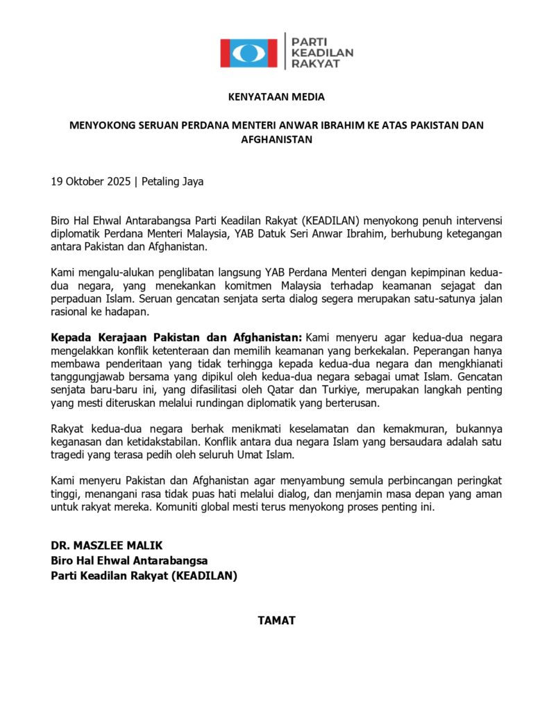 19 Oktober 2025 | Petaling Jaya Biro Hal Ehwal Antarabangsa Parti Keadilan Rakyat (KEADILAN) menyokong penuh intervensi diplomatik Perdana Menteri Malaysia, YAB Datuk Seri […]