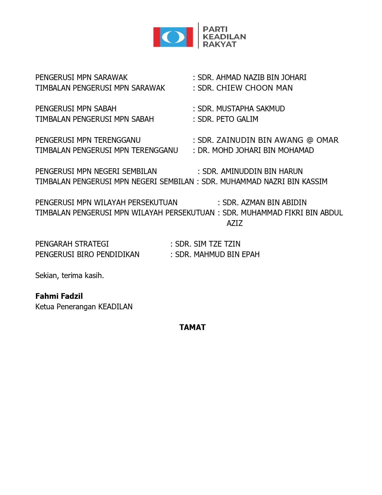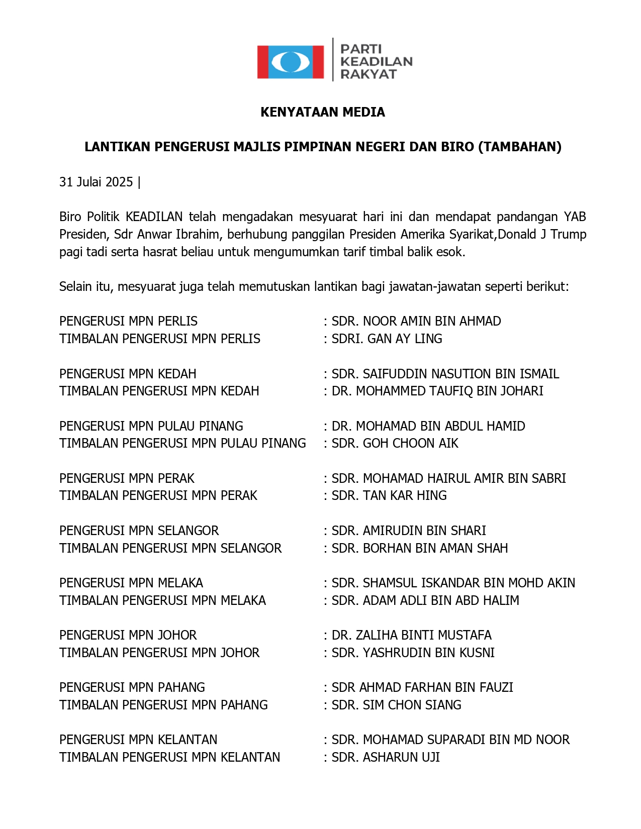 Lantikan Pengerusi Majlis Pimpinan Negeri Dan Biro